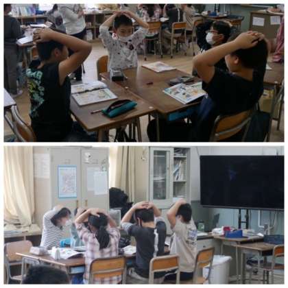 5年生は、外国語科(英語)で、班ごとに色の英単語を聴いて頭文字の付いているグッズ取りゲームをして楽しく学習していました。