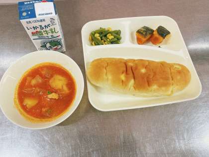 今日の給食は、ケチャップ煮.さんどまめとコーンのサラダ.焼きかぼちゃの甘みつかけ.おさつパン.牛乳です。