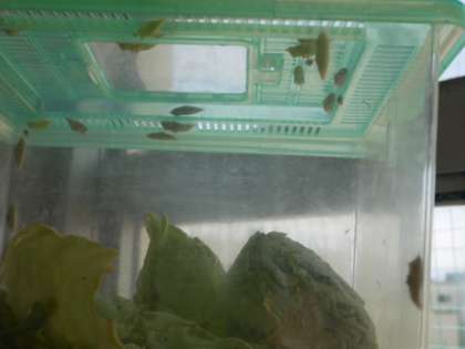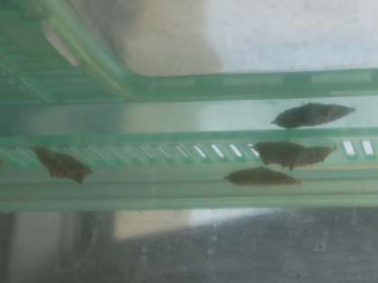 3年の教室前の廊下に虫かごが置いてあります。よーく見てみると、なんとモンシロチョウのサナギがたくさんくっついています!