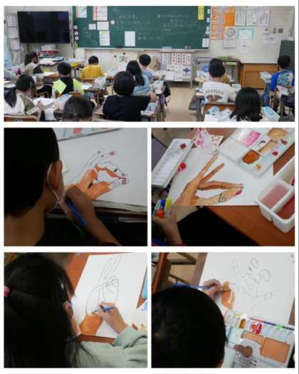 4年生は、「わたしの手」をよく見て描いて、色を工夫して作りました。