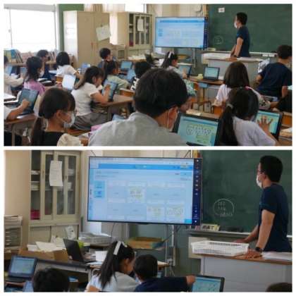 3年生は、算数科でわり算の学習をしています。一人一台学習者用端末の発表ノートを使って、大型モニターに子どもたちの考え方が映し出されていました。