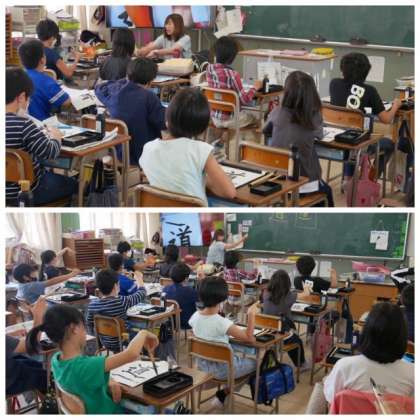 5年生は、書写の学習で「道」を毛筆で書きました。一画一画、何に気を付けて書けばよいかを大型モニターで確かめながらていねいに書いていました。