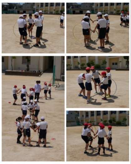5年生は、体育科で体つくりの運動として、グループで輪になって手を離さないようにしてフープを送っていきました。みんなチームワークよく、スムーズにフープを送ることができていました。