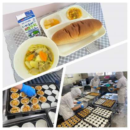 今日の献立は、変わりピザ.豚肉と野菜のカレースープ煮.ミックスフルーツ缶.黒糖パン.牛乳です。