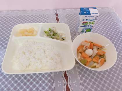 今日の給食は、八宝菜.チンゲンサイともやしのしょうがづけ.パインアップル缶.ご飯.牛乳です。