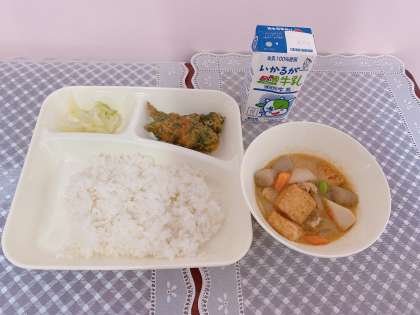 今日の献立は、ちくわのいそべあげ.あつあげとさといものみそ煮.あっさりキャベツ.ご飯.牛乳です。