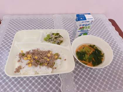 今日の献立は、3食丼、3食スープ、3食酢のもの、牛乳です。