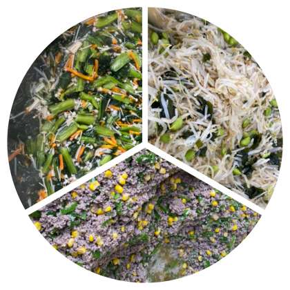 今日の献立は、大阪市の学校給食コンクールの優秀賞作品です。丸山小学校の子どもたちが考えました。3つのおかずには、それぞれ3色の食べ物が入っています。