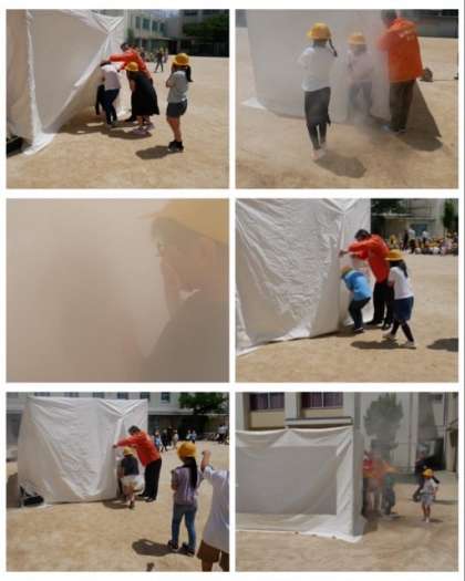 1年生から4年生は、煙を充満させたテントの中を通り抜ける体験をしました。煙をあまり吸い込まないように、姿勢を低くして、煙で視界が悪いので壁を伝って抜け出しました。