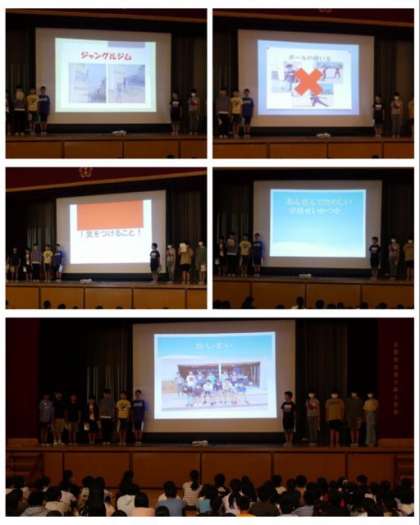 内容は、運動場で安全に遊ぶための約束について、写真をスライドにしたものを映してわかりやすく発表しました。