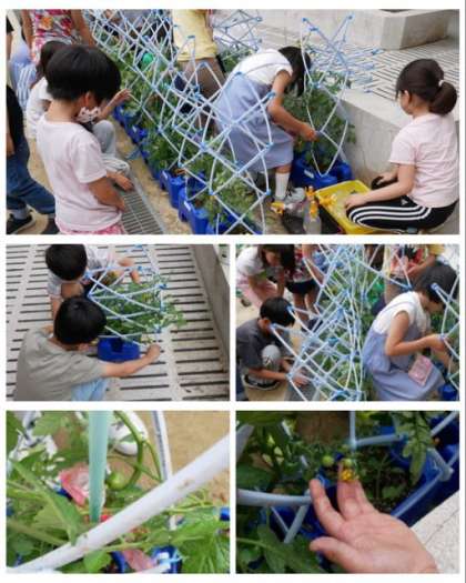 2年生が育てているミニトマトがどんどん大きく成長してきました。トマトの実もたくさんできていて、倒れないように支柱を立てて水をやりました。