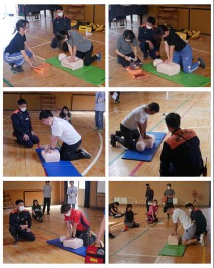 今週の木曜日のプール開きを控えて、消防士の方に来ていただいて、救急救命の講習を行いました。胸骨圧迫や、AEDの使い方について実習をしました。