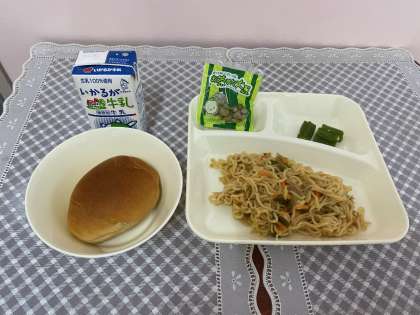 今日の献立は、和風焼きそば.オクラの甘酢あえ.まっちゃ大豆.黒糖パン.牛乳です。