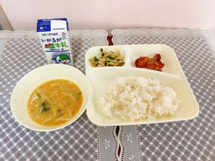 今日の献立は、鶏肉のしょうゆバター焼き.野菜炒め.みそ汁.ご飯.牛乳です。