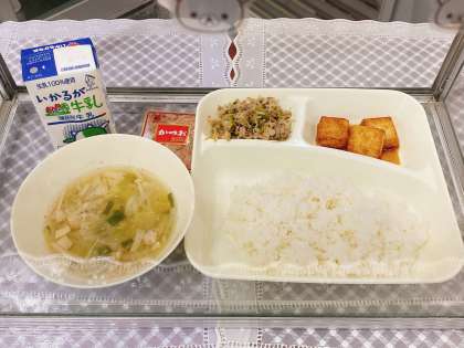 今日の献立は、ゴーヤーチャンプルー.あつあげのしょうがじょうゆかけ.五目汁.ご飯.牛乳です。