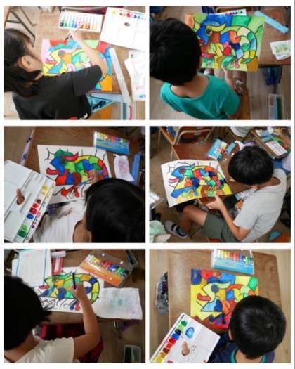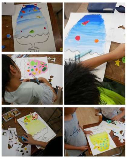 絵の具に水の分量を加減して混ぜて、おいしそうなかき氷を表したり、鮮やかに色彩をしたカメレオンを表したりして楽しみました。