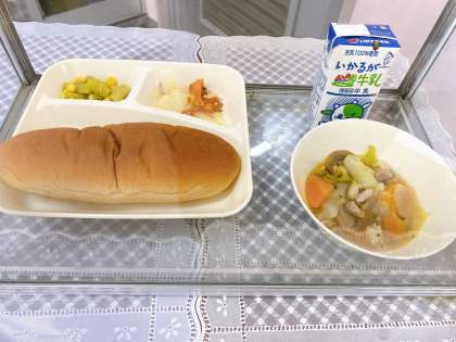 今日の給食は、じゃがいもとトマトのチーズ焼き.鶏肉とてぼ豆のスープ.グリーンアスパラガスのサラダ.黒糖パン.牛乳です。