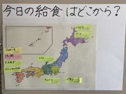 給食は全国(世界)のいろいろなところから食材が集まって、できています。給食室の前にどこから来た食材なのか掲示を始めました。ぜひ見てください。