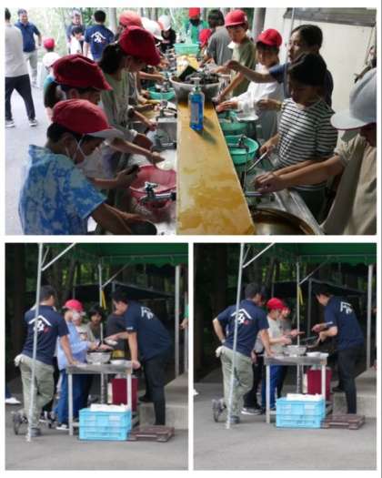 お鍋や飯盒の汚れをしっかり取り除けるまで宿舎の方の厳しいチェックがあります。