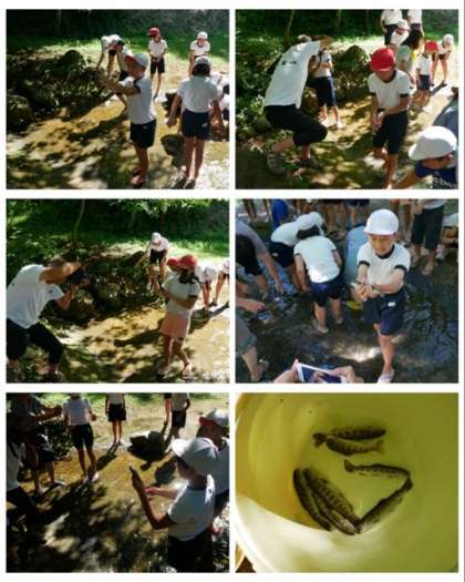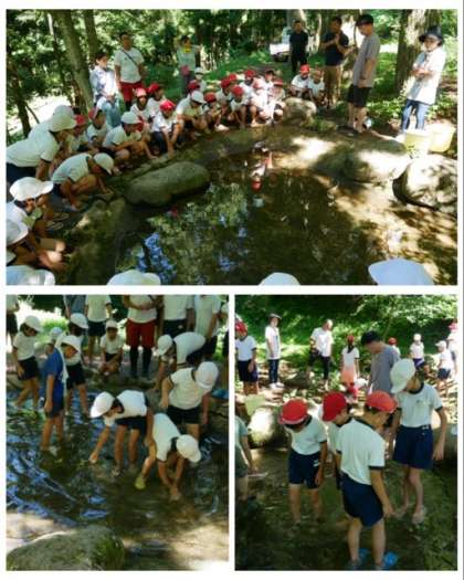 林間学習2日目の一つめの活動は、魚つかみです。放流したあまごやいわなを手でつかんで獲ります。