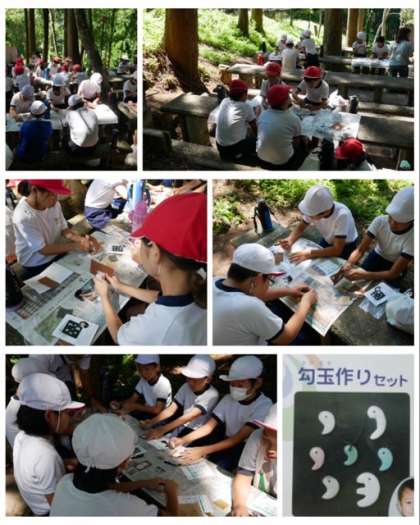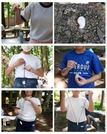 魚つかみのあとは、勾玉作りに挑戦しました。ひたすらサンドペーパーで石を削って形を作っていきます。みんな白い粉まみれで頑張りました。