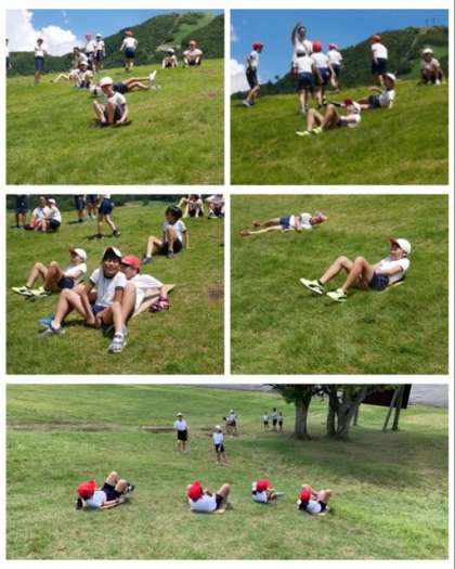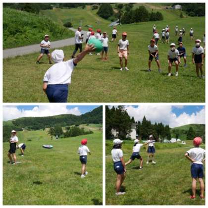 活動と昼食の間に少し時間ができたので、高原でドッジボールやドッジビー、ダンボールのソリなどで自由に遊びました。