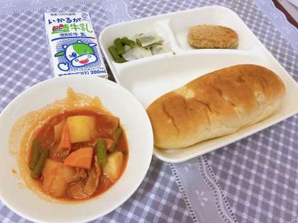 今日の献立は、チキンレバーカツ.ケチャップ煮.グリーンアスパラガスとキャベツのサラダ.おさつパン.牛乳です。
