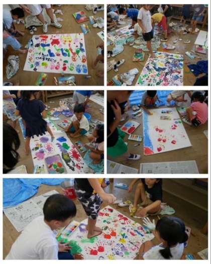 2年生は、手や足に絵の具を付けて模造紙に手型や足型を活かしてグループで通学路の風景を表しました。みんな楽しそうです。