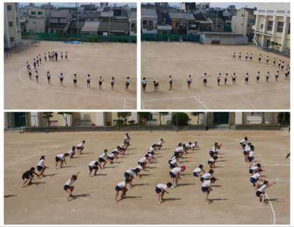 6年生は、初めて運動場に出て、隊形移動も含めて団体演技の南中ソーランをしました。