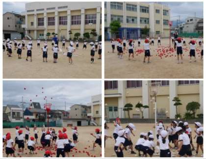 1年生は、運動場で玉入れをしました。途中でダンスもしながら、一生懸命にカゴめがけて玉を投げ入れてました。