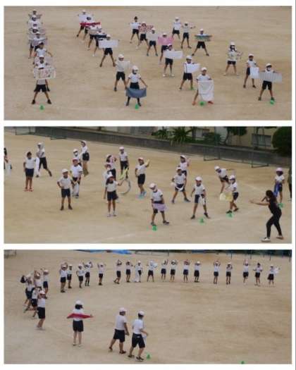 4年生は、運動場で団体演技の練習をしました。さて、本番ではタオルをどのように使うのでしょうか。