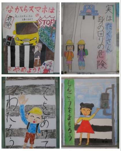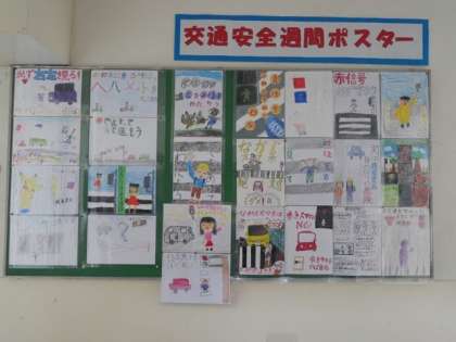 夏休みの宿題の1つとしてPTAより依頼のあった秋の交通安全週間に向けた啓発ポスターに応募してくれた作品を1階の掲示板に展示しています。