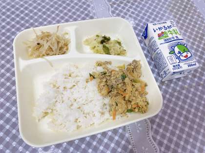 ★ 他人丼 ★ ささみと野菜のいためもの ★ もやしの甘酢あえ ★ 牛乳です。