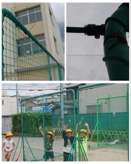 写真では少しわかりづらいですが、防球ネット3台を使ってミストシャワーを設置しました。試運転していると、気づいた子どもたちが気づいて集まってきて、「涼しい〜」と気持ちよさそうでした。