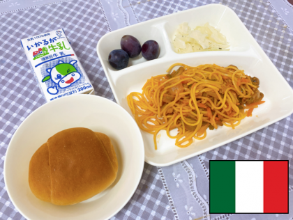 韓国朝鮮→インドとめぐってきた、『給食で世界旅行』ですが、今週の最後はイタリアです。スパゲティーはイタリアで生まれた料理です。スパゲッティーとは、イタリア料理で使われる麺類のひとつで、今日の給食のような細長いものをいいます。細さや形によっていろいろな名前があります。
