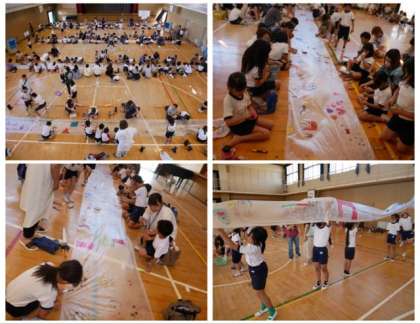 2年生と4年生は、お家の方と一緒に体育館いっぱいを使って、のびのびと絵をかきました。
