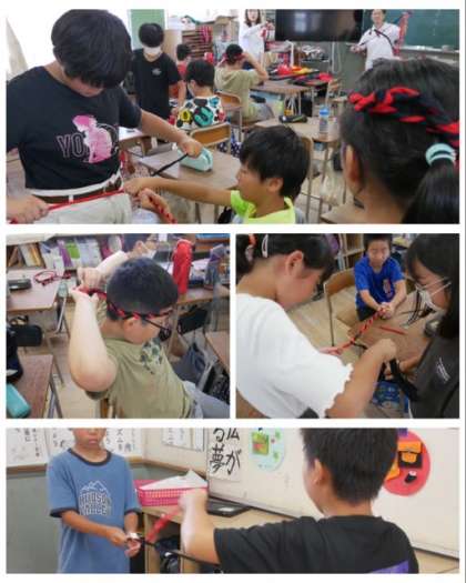 5年生は、運動会の団体演技で使うねじり鉢巻きを作っていました。出来上がった鉢巻きを早速、頭に巻いていました。