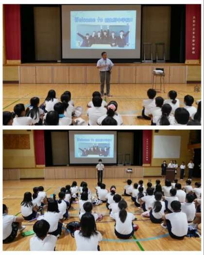 まずは、体育館で新生野中学校の校長先生から歓迎のあいさつをしていただきました。