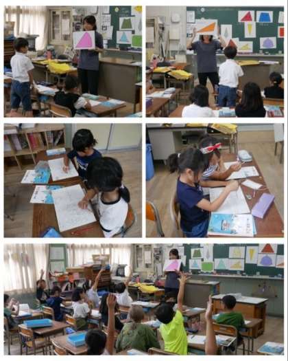 2年生は、算数科「長方形と正方形」で、いろいろな図形の中から三角形と四角形を見つける学習をしました。