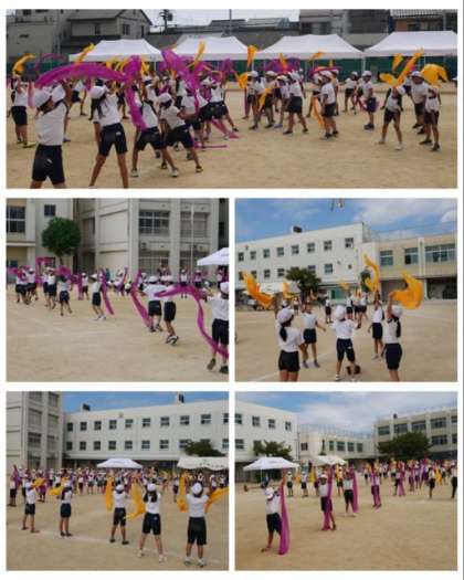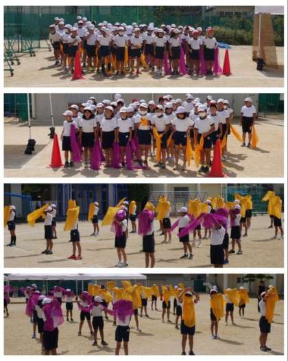 中学年は、オーガンジーの布の扱いにも慣れてきて、音楽に合わせて振ったり、回したり、投げ上げたり、運動場いっぱいを使って表現していました。