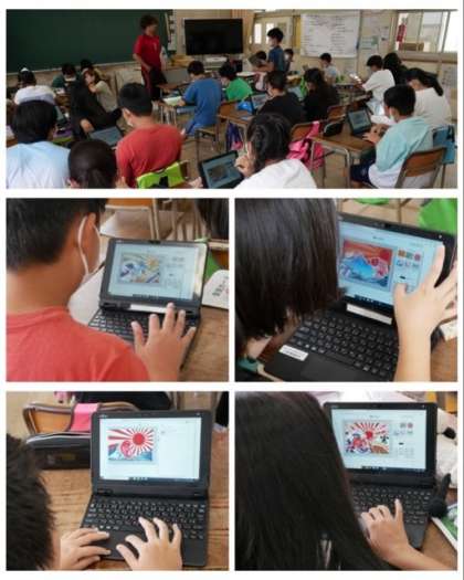 6年生は、図画工作科で制作する「大量旗」を一人一台学習者用端末を使ってデザインしていました。