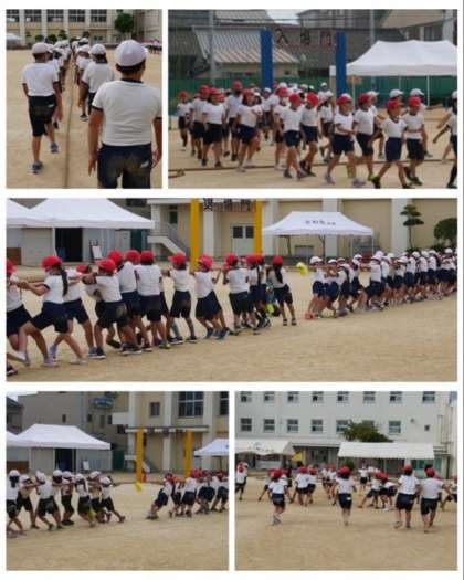 3年生と4年生は、綱引きです。2回戦は、まず3年生が綱を引き、途中から4年生が助っ人に入ります。今日の練習でも赤組・白組接戦でした。見ている方も、思わず手に力が入ります。