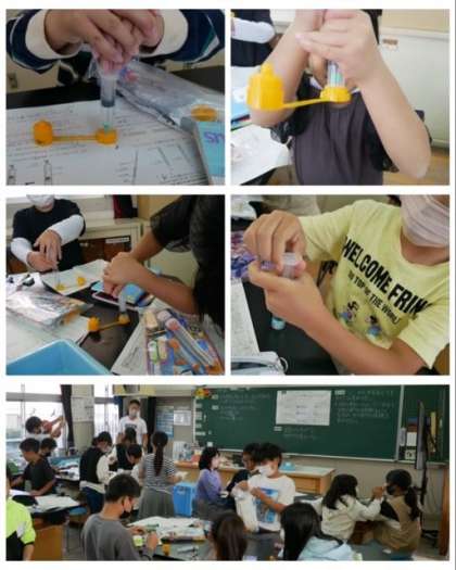 4年生は、理科の学習で「水も空気と同じように押し縮めることができるのだろうか」という課題を実験で調べました。