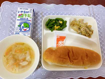 ★さんどまめとコーンのサラダ(ノンエッグドレッシング)★おさつパン★牛乳
