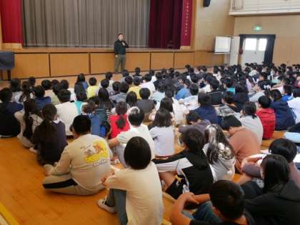 安全が確認されて講堂に避難したあと、警察署に方から、不審な人と遭遇した時の心構えや対処の仕方についてお話を聴きました。