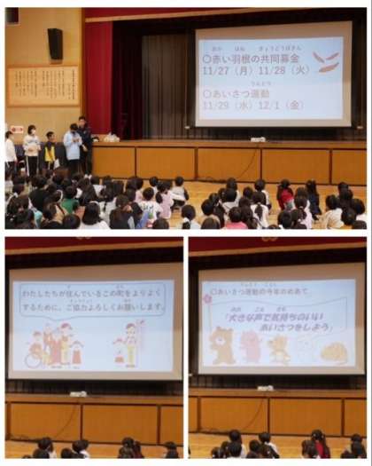 赤い羽根共同募金では、「わたしたちの住んでいるこの町をよりよくするために、募金にご協力よろしくお願いします」あいさつ運動では、「大きな声で気持ちのいいあいさつをしよう」と呼びかけました。