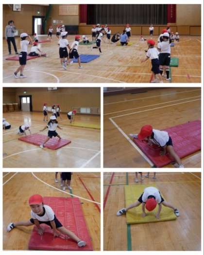 1年生は、体育科の学習でマットあそびをしました。前回りだけではなく、開脚前転にも挑戦していました。