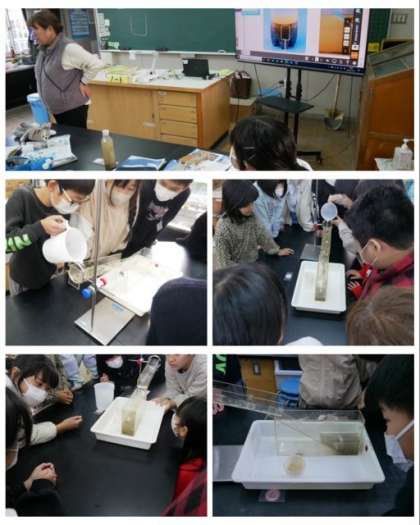6年生は、理科の学習で川を流れる土砂がどのように堆積していくのか実験装置を使って調べています。