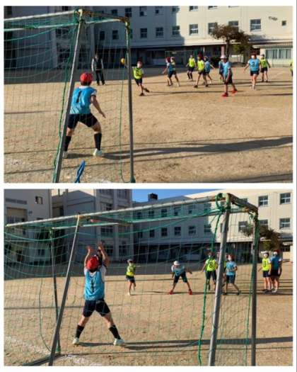 6年生は、体育科でハンドボールの学習をしています。パスをつなぎながら、シュートします。