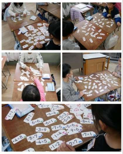 2年生は、算数科で学習した九九の定着のため、九九カードをカルタのように並べて二人組になって対戦しました。